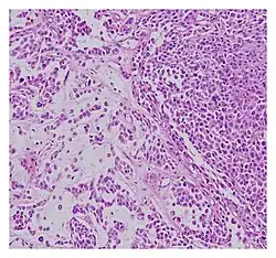Diagnosing malignant mixed tumours is difficult as there many types of tumours and their variants.[9] Malignant chondroid syringoma is particularly challenging to distinguish from other skin tumours as it is prone to the absence of definitive symptoms and an ambiguous clinical presentation.[3] Some signs that help determine diagnosis of malignancy include: "mitosis, nuclear atypia, pleomorphism, lymphatic invasion, and local recurrence" (IADVL, 2004).[11] Though it is usually found within women in the forties, the youngest-recorded case was fourteen years old and the oldest was eighty-six.[12] The tumour is described as invasive[12] and is clinically characterised by faster growth than the benign chondroid syringoma. They can generally be diagnosed when presenting "an epithelial component, eccrine or apocrine differentiation and myoepithelial component of fluctuating prominence" (IADVL, 2004).[11] Diagnosis is recommended to follow microscopic analysis to ensure correct examination.[8]