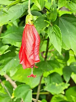Malvaviscus is a genus of flowering plants in the mallow family, Malvaceae.[2] Common names for species in this genus include Turk's cap mallow, wax mallow, sleeping hibiscus, and mazapan. It belongs to a group of genera that differ from the closely related Hibiscus in possessing a fruit divided into 5 separate parts (a schizocarp), and having a style surmounted by 10, rather than 5, capitate or capitellate stigmas. Among those genera Malvaviscus is distinguished by having auriculate petals and red, fleshy fruits. The generic name is derived from the Latin words malva, meaning "mallow," and viscus, which means "sticky," referring to the mucilaginous sap produced by members of the genus.[3] The fruit can be used to make jelly or syrup. Both the fruit and flowers are used to make herbal teas.[4]