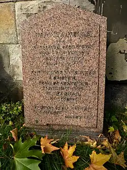Malvina Wells is buried under a marble headstone erected by the Macrae family in the graveyard of St Johns Church, Princes Street, Edinburgh.[1][3][4] It lies to the right of a larger family memorial to Joanna Isabella Maclean, for whom she worked.[1] The inscription records that she was a faithful friend and servant.[3]