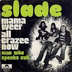 "Mama Weer All Crazee Now" is a song by the British rock band Slade, released in 1972 as the lead single from their third studio album Slayed? It was written by lead vocalist Noddy Holder and bassist Jim Lea, and produced by Chas Chandler. It reached No. 1 in the UK, giving the band their third number one single, and remained in the charts for ten weeks.[2] In the United States, the song reached No. 76.[3]