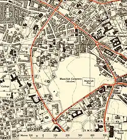 Mamilla Cemetery, sometimes called Ma'aman Allah Cemetery (Arabic: مقبرة مأمن الله), is a historic Muslim cemetery in West Jerusalem that dates back to the Crusades, and lies just to the west of the north-west corner of the walls of the Old City of Jerusalem, near the New Gate.[1][2][3] The cemetery, at the center of which lies the Mamilla Pool, contains the remains of figures from the early Islamic period,[4] several Sufi shrines and Mamluk-era tombs.[2] The cemetery grounds also contain the bodies of thousands of Christians killed in the pre-Islamic era, as well as several tombs from the time of the Crusades.