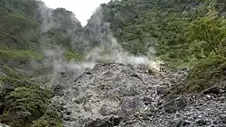 One solfataric area emits a high-temperature (106 degrees C) plume to 30 m height with a roaring noise like a high-pressure geothermal borehole.