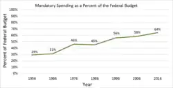 Mandatory spending has taken up a larger share of the federal budget over time.[3] In fiscal year (FY) 1965, mandatory spending accounted for 5.7 percent of gross domestic product (GDP).[4] In FY 2016, mandatory spending accounted for about 60 percent of the federal budget and over 13 percent of GDP.[5] Mandatory spending received $2.4 trillion of the total $3.9 trillion of federal spending in 2016.[5]