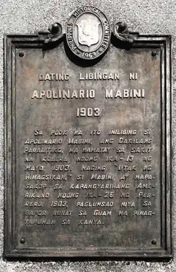 Located along a street named in his honor (馬美爾路), Apolinario Mabini's former burial site is marked by a triangular pyramid on a raised pedestal, symbolic of his Masonic beliefs (hence his original interment at the cemetery in 1903); and a historical marker by the NHCP (then the "Philippine Historical Committee") affixed in 1963. His remains were exhumed in this place and transferred to the Mausoleo de los Veteranos de la Revolución. Years later, it was reburied in his hometown at Tanauan, Batangas.