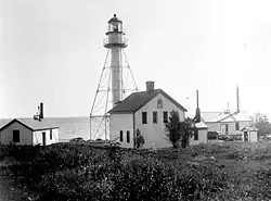 The first lighthouse on Manitou Island was a rubble-stone tower[3] built in 1850.[2] In 1861, the current light replaced it (one of three built that year with iron structure by the West Point Foundry in New York;[4] the other two were De Tour Reef and Whitefish Point lights, the latter of which still stands and it and Manitou are the oldest iron skeletal light towers on the Great Lakes); the keeper's house was built the same year.[2] A fog signal was added in 1871, and buildings to house it in 1875. These signals were refurbished in 1899.[5] In 1895, an oil house was added, in 1901 a boathouse, and in 1930 a concrete fog signal building was constructed, replacing the earlier one.[3] It is the oldest iron skeletal light tower on the Great Lakes.[2]