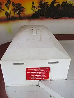 Queiroz mentioned Cleric Francis Xavier and Uraccinga (llam Singai) a sort of Governor- tributary prince were martyred. There is also an old tradition recorded by Dr. Bonjean in the Missions Catholiques of Lyons that the king and his executioners were on hot pursuit for a convert named Santa Cruz as he had been going about among the Christians comforting and encouraging them to lay down their lives joyfully for God. Executioners severed his head with one stroke of the sword.[4]: 45 Martyrdom likely occurred between October 1544 and December 1544, most likely in November or early December. The Portuguese called Mannar Island Illa dos Martyres.