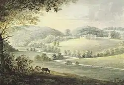 in what manner he had contrived, in the erection of his handsome front, not to destroy the principal part of the old Mansion; which I had remember'd about 20 years ago, a very venerable and extensive pile of Buildings – from the room in which we had been sitting at the Eastern extremity of the new front I was conducted through two others, to the other end on the West – which I found was lighted at both its extreme parts (for it was of an oblong form) preserving in the modern front a uniformity in its windows with the rest of the Building; and retaining at the opposite end an old semicircular window, with its stone mullions – through this, I perceived another similar bow correspondent – separated from each other by a doorway &c that in its antient state had formed the Western entrance.[26]