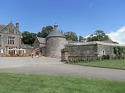 To the east (right) of the entrance is the great hall, which has two tall six-lighted windows with single transoms. The roof-space was subsequently ceiled to form a 65-foot long gallery above, said by Pevsner to be the best example from the 16th century in Devon. On its plaster ceiling survive the initials of the builder Sir Roger Bluett (died 1566), which makes it the earliest datable plaster ceiling in Devon.[4] The north and west ranges were added or rebuilt in the Victorian age, c. 1859–68 by Rev. W. Rayer to the design of John Hayward. A prominent feature of the south aspect of the house is the large circular dovecote on the east (right) side, further east of which is the stable court yard