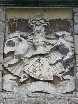 A heraldic achievement is sculpted on the north facade of West Molland Barton, above the front door. On a scroll below an escutcheon couché bearing three roundels a label of three points in chief each point charged with three roundels is the following legend in Roman capitals: “This is the armes of Hugh Courtny sometimes Earle of Devon who was grandfather unto Sr. Phillip Courtny of Mol.nd., knight” (sic).[67] The tomb and effigies of the Earl and his wife Margaret Bohun, heiress of Powderham, can be seen in Exeter Cathedral. Shown as supporters are: dexter, the Bohun swan, sinister the boar of Courtenay. The crest of Courtenay is generally given as: out of a ducal coronet or, a plume of seven ostrich feathers four and three argent.[68] The crest at West Molland shows 10 feathers, three, four, three. The second crest of the Courtenay Earls of Devon is: A dolphin embowed proper, which may be seen here behind the escutcheon.