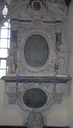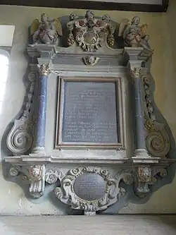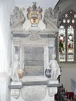- ^ "North wall north aisle large wall monument with small urns flanking achievement above shouldered surround with puttis to each side and winged skull below to Lewis Rosier d.1676 with original painted decoration". Text of English Heritage listing.