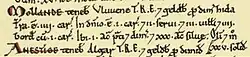 The bishop has a manor called "Mollanda" which Ulwena held TRE and it paid geld for ½ hide. This 4 ploughs can till. Drogo holds it of the bishop. Thereof Drogo has 1 virgate and 1 plough in demesne and the villeins 1 virgate and 1 plough. There Drogo has 3 villeins, 4 bordars, 2 serfs, 8 beasts, 10 swine, 40 sheep, 30 acres of woodland and 1 ½ acres of meadow. Worth 25s. And it was worth the same when the bishop received it.[83]