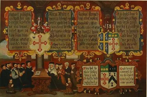 Richards two eldest sons were George born 1516 and his second son born 1518 was James Pilkington, born in about 1518, the son of Richard Pilkington and Alice Asshawe. He was the first Protestant Bishop of Durham in 1560 and founded Rivington School in 1566. Robert Pilkington the bishop's grandfather died at Rivington in 1508 having been a lord of the manor for more than 30 years.[17] The division of the manor was illustrated at the 1536 enclosure of manorial waste of 50 Cheshire acre. The three lords of the manor[3] were Richard Pilkington, who enclosed 13 acre, James Shaw 3 acre, and George Lathom 4 acre. The Priest of Rivington Church was given 30 acre.[18] Litigation about the manor wastes was frequent for the next eight decades.[19] At Rivington the larger Cheshire Acre measure was used until the 20th century.[20] There are Court Rolls of the Wapentake Court for the period 1522 to 1528 within the Duchy of Lancaster records covering Rivington.[21][22]