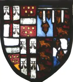 - Thirdly, on 4 December 1548, to Margaret Donnington[65][66] (died 1562) daughter and sole heiress of John Donnington (died 1544) of Stoke Newington, a member of the Worshipful Company of Salters,[67][68] by his wife Elizabeth Pye.[69] Margaret Donnington was the widow successively of Sir Thomas Kitson (died 1540), the builder of Hengrave Hall in Suffolk, and next of Sir Richard Long (died 1546) of Wiltshire, Great Saxham and Shingay, Cambridgeshire, Gentleman of the Privy Chamber to King Henry VIII. Margaret Donnington was a strong-minded lady who insisted that at the same time as her marriage to Bourchier, his son and heir should marry her own daughter Frances Kitson. The double marriage took place at Hengrave on 11 December 1548.[70] Thus the 2nd Earl's eldest son from his 2nd marriage to Eleanor Manners,[62] John Bourchier, Lord FitzWarin (who predeceased his father), married his own step-sister, Francesca Kitson, and was by her the father of William Bourchier, 3rd Earl of Bath. Margaret Donnington and Bourchier made Hengrave their home[64] and Bourchier was buried at Hengrave with his wife in a significant marble tomb.[70] Stained glass in the cloister of Hengrave Hall survives memorialising the Bourchier residency, showing ten quarterings of Bourchier (Bourchier, Louvaine, FitzWarin, Audley, Cogan, Hankford, Brewer,[b] Martin, Dinham, Arches) impaling Donnington (Argent, three pallets azure on a chief gules three bezants)[71]