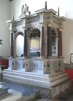 The "Bourchier Pew" (or "Manorial Pew") in the north transept was made in about 1550 in Franco-Flemish early Renaissance style,[18] and decorated with Bourchier knots, it was used by the lords of the manor of Tawstock. The unusual and small manorial pew [a] has been mistaken for a confessional due to its box-like appearance.