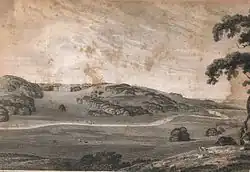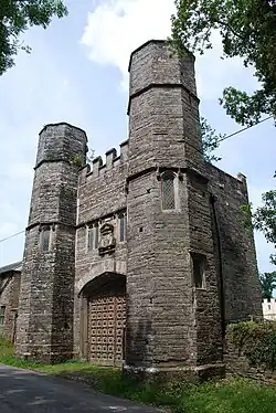 The Elizabethan mansion re-built by William Bourchier, 3rd Earl of Bath, no longer exists apart from the gatehouse, with date-stone 1574. Four years after Sir Bourchier Wrey, 7th Baronet, inherited the estate the house burned down in 1787 and was rebuilt by him in the Neo-Gothic style by about 1800, when Rev. John Swete described visiting it in his travel journal: "Entering through a gateway of antient date by the stables I arrived in front of Tawstock House the seat of Sir Bourchier Wrey which when completed (for it is now but a shell) will be one of the finest houses in the county".[8] Part of the Elizabethan house survives today on the south front. The north front was re-modelled in 1885.[9]
