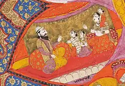 ![]() Guru Amar Das' family. Guru Amar Das, Mansa Devi, and three children. Manuscript painting, ca.1839–1843. | |
