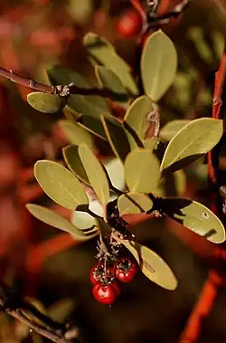 Manzanita is a common name for many species of the genus Arctostaphylos. They are evergreen shrubs or small trees present in the chaparral biome of western North America, where they occur from Southern British Columbia and Washington to Oregon, California, Utah, Arizona, New Mexico, and Texas in the United States, and throughout Mexico. Manzanitas can live in places with poor soil and little water. They are characterized by smooth orange or red bark and stiff, twisting branches. There are 107 species and subspecies of manzanita,[1] 95 of which are found in the Mediterranean climate and colder mountainous regions of California, ranging from ground-hugging coastal and mountain species to small trees up to 20 feet (6m) tall. Manzanitas bloom from winter to early spring and carry berries in spring and summer.[2] The berries and flowers of most species are edible.