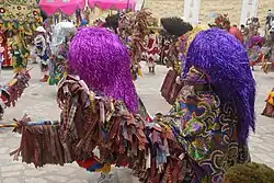 Maracatu cearense is Fortaleza's variant of maracatu nação. Brought to Fortaleza, Ceará, in 1936, maracatu cearense has since been cultivated as the city's most distinctive Carnival performance tradition, owing in part to its use of blackface makeup to enact Afro-Brazilian characters and male-to-female transvestitism of the important female personages, particularly the queen. Its rhythms are described locally as cadenciado, "cadenced," which amounts to a less syncopated, steadier 2/4 meter and a slower tempo than is found in the maracatu nação of Pernambuco, sometimes as slow as 45 beats per minute. In recent decades groups have tended to divide into those that retain the slow tempo (to express the misery of slavery) and those that speed up their tempos (to express the exuberance of Carnival), and there is some dispute over which style most authentically expresses the tradition in Ceará.[1] Standard instrumentation is also distinctive. Instead of alfaia drums, the cearense tradition uses surdo or bombo drums; like Pernambuco, it uses the Tarol, or snare drum. Instead of the gonguê, large single-head bell, maracatu cearense uses the ferro, a heavy iron-slab triangle, to keep its steady duple rhythm. Individual groups often add to or slightly modify this setup to create their own distinct sound.