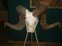 The sheep is particularly known for its long, spiraling horns which have been measured having a span up to 140 cm (55 in).[10] They have the longest horns of all sheep,[11] with the longest individual horn ever recorded measuring 1.9 m (6.2 ft) and weighing 60 lb (27 kg).[12] O. a. polii's horns follow a coil pattern, with the tips pointed directly away horizontally from the head;[13] in spite of this, the tips are rarely broken.[14] The horns have long been a popular attraction for trophy hunters.[4] They begin growing 15–20 days after the sheep are born, and their growth in length is most pronounced during the first year.[15] Thickness growth is most noticeable during the first two years.[15]