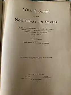 Whiting was born in Chester, Massachusetts, and went to school in Chicopee and Holyoke, Massachusetts. While living in Holyoke, she taught sewing at the Holyoke Women's Club.[2] With her widowed mother and her sister, she moved to Deerfield in 1895, where Ellen Miller's family had lived since 1893.[3] She and Ellen Miller both studied at the National Academy of Design, and in the summer of 1884, they were students of Robert Crannell Minor, part of the Barbizon school of painters.[4] In 1895, Whiting and Miller together wrote and illustrated Wild Flowers of the Northeastern States.[5] The book contains about 300 drawings, about half of which were signed by Whiting with a "W."[6]