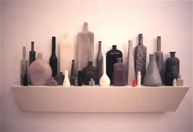 Around this time, Porges developed a predilection for working with wax and began creating the cast wax bottle sculptures for which she became widely known.[18][24][38] Appearing in groups, the bottles bore thought-provoking labels and evoked apothecary medicines in their arrangement on shelves and in cabinets.[39] Those that appeared in her 2000 show "Miraculous Vessels" were described by New York Times critic Ken Johnson as "poetic" and "metaphysical," suggesting such impalpable contents as "Youth With Wisdom," and "Solitude Without Loneliness."[25] In similar fashion, her 1999 sculpture Natural Magic: Cures for Modern Maladies features a miscellaneous assortment of bottles with intangible labels such as "For Compassion Fatigue" and "To Relieve Boredom." The bottles are grayscale in tone save for a small red one marked "Drink Me."[8] Her satirical piece Acts of (Self) Deception (2000) critiques the hyperbolic use of language with imaginary bottle contents that include "The Science of Square Dancing" and "The Art of Point-of-Purchase Packaging."[18]