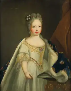 Mariana and Joseph would soon have a close relationship. The couple enjoyed hunting as well as music – Mariana Victoria was an accomplished singer – they patronized Italian opera singers and the theatre but were both passionately religious. Despite this, her husband maintained various mistresses, much to the dislike of his strong-willed wife. During her marriage, Mariana Victoria gave birth to eight children, four of whom survived infancy.[8] Her first child Infanta Maria was given the style Princess of Beira as the heir apparent to her father. Two of Mariana Victoria's daughters remained unmarried. Her daughter Infanta Mariana Francisca was a proposed bride for the Dauphin of France, son of Louis XV, but Mariana Victoria herself rejected the plan. When her other daughter Infanta Doroteia was proposed as a wife for the future Philippe Égalité Mariana Victoria again refused to the match. Her youngest daughter Infanta Benedita married José, Prince of Brazil, Mariana Victoria's grandson. The latter marriage was organised by Mariana Victoria herself after the death of her husband.[9]