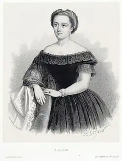 Cabel continued singing at the Théâtre Lyrique, creating the roles of Corbin in François-Auguste Gevaert's Georgette ou Le moulin de Fontneoy (28 November 1853) and Marie in Louis Clapisson's La promise (16 March 1854).[12] The Musical World of 25 March 1854 suggested that "although not a work of the first class, it [La promise] will probably have a run, owing to the manner in which the principal part is sustained by Mlle Marie Cabel…."[13] This proved to be true, as it was performed a total of 60 times, that season and the next.[14] Near the end of the season in May, Cabel was on leave and appeared in Bordeaux and Nantes, but was announced, and may have returned, for a benefit performance of La promise at the Théâtre Lyrique on 1 June.[15]