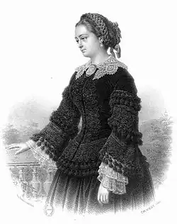 It was in Lyon that she was discovered by Jules Seveste, the director of the Théâtre Lyrique in Paris.[9] Seveste engaged her for the 1853–1854 season at his theatre, where she made her debut creating the role of Toinon in Adolphe Adam's Le bijou perdu on 6 October 1853. Fétis described her as "young, fresh, winsome, cheerful, having the devil of a body, lacking at the time taste and musical style, but blessed with an adorable voice, of a marvelous purity, whose brilliant and silvery timbre produced an amazing effect on the public, with which she launched the most difficult lines with amazing confidence and assurance…"[10] Georges Bousquet, writing in the Revue et Gazette Musicale of 9 October 1853, reported that the hit of the show was Cabel's performance of the aria "Ah! qu'il fait donc bon cueillir la fraise".[11] She became such a popular star that the company, located in the working class district of the Boulevard du Temple, began to attract a well-heeled audience, including Emperor Napoleon III and his new bride Eugénie de Montijo.[9]