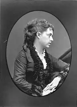 Marie Delaporte did not return to the Gymnase until 22 September 1874, when she created the role of Gilberle. After another year in Russia she returned to star at the boulevard Bonne-Nouvelle on 25 August 1875 in a reprise of Froufrou, a role that was originally created for Mme Desclée.[3] In June 1876 Marie Delaporte was in London with M. Andrieu, and appeared in private performances of L'Autre Motif by Édouard Pailleron and various pieces suitable for one or two performers.[7] Her last appearances seem to have been at the Vaudeville from 23-30 December 1877 in Une Séparation and on 1 March 1878 in the Bourgeois de Pont-Arcy.[3] She later taught diction at the École Normale Supérieure.[1] She lived in Paris from 1884 to 1904. In 1884 she was named an Officer of the Academy, and in 1899, at the age of 60, she was given a pension of 500 francs by the Société des artistes.[3]
