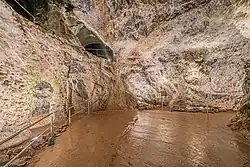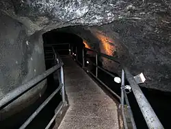 In 1952 and 1953, miners from VEB Schachtbau Nordhausen searched within the neglected site for copper mulm. Copper mulm is a loose copper ore mixed with other metals and was used as a dye. However, the deposit was not sufficiently substantial for mining, leading to the cessation of the search after excavating a total of 312 meters. In 1964, preparations began for the reopening of the Marienglashöhle on behalf of the Friedrichroda town council. The following year, miners from the VEB Thüringer Spat- und Eisenerzgruben in Schmalkalden entered the collapsed gallery and advanced to reach the cave. The Friedrichroda fire department played a crucial role in draining the cave, employing powerful pumps for this purpose. A comprehensive restoration effort was undertaken in 1967 and 1968, spanning a total of 16 months. During this restoration, an artificial waterfall was created, utilizing water pumped up from the cave lake on the lower level. Additionally, an exit gallery was built, allowing visitors to follow a circular route. The entrance gallery, known as the Herzog-Ernst gallery, was rebuilt, and equipped with five geological windows, offering visitors insights into the geological structure of the cave. In the same year, the Crystal Grotto was designated as a protected geological natural monument. On November 30, 1968, this exhibition and educational site was reopened to visitors. In 1974, another tunnel dating back to the 18th century was discovered. Over time, the cave complex has continually been improved and adjusted to better cater to the needs of visitors.[8][9]