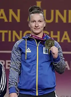 Mariia Hanhur (Ukrainian: Марія Гангур; born (2000-08-24)24 August 2000) is a Ukrainian weightlifter, and European Champion. She won the gold medal in the 2022 European Weightlifting Championships in the 64 kg event.[2][3] She won the silver medal in her event at the 2023 European Weightlifting Championships held in Yerevan, Armenia.[4]