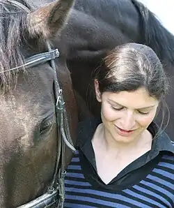 In 1998 the book service of Algeria called upon her to illustrate a new edition of Les chevaux du Sahara.[10] She contributed to various books for different publishers and to equestrian magazines such as " Cheval pratique ". A book lover, she enjoys working with a team, publishers and authors, sharing knowledge. In 2002 she hosted a presentation of her works about horses, followed by a workshop at the Arab World Institute in Paris ; her book Les chevaux du vent, oiseaux sans ailes, was published at the same time.[5][11]