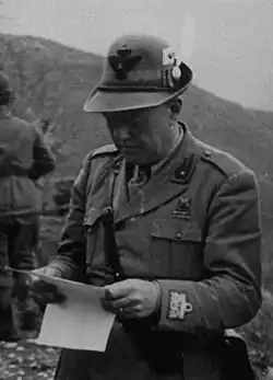 He was later transferred to the Army reserve and held various associative positions, including that of Vice-President of the National Union of Retired Officers of Italy, enrolling in the Roman section of the National Alpini Association, and collaborating with numerous magazines. He died in Rome on November 3, 1957, and his funeral was attended by Marshal of Italy Giovanni Messe, while a battalion of the 4th Alpini Regiment rendered the military honors during the burial.[12]
