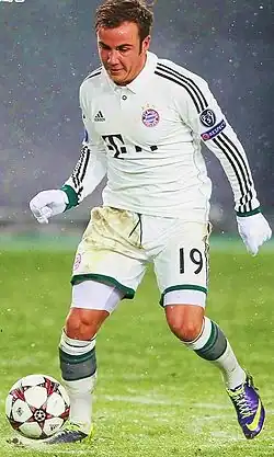 On 23 October, Götze scored his first competitive goal for Bayern in a 5–0 Champions League group stage win over Viktoria Plzeň at the Allianz Arena. He also assisted Bastian Schweinsteiger in the game.[38] On 26 October 2013, Götze came on as a substitute for Toni Kroos in the 25th minute and scored his first Bundesliga goal for Bayern Munich with a header in a 3–2 win against Hertha BSC.[39] On 2 November, he made his return to starting line-up in a 2–1 away win for Bayern against TSG 1899 Hoffenheim. On 23 November, Götze came off the bench and scored the first goal of a 3–0 away victory over former club Borussia Dortmund.[40] He did not celebrate the goal out of respect to Dortmund.[41] In the team's next fixture against CSKA Moscow, Götze scored the second goal of 3–1 away win in the 2013–14 UEFA Champions League group stage.[42] On 7 December, Götze helped Bayern by netting a goal in the closing minute, as well as assisting Thomas Müller, in a dominant 7–0 away victory over Werder Bremen.[43] On 17 December, Götze scored a long-range goal in the 47th minute against the AFC champion Guangzhou Evergrande, helping Bayern win 3–0 and advance to 2013 FIFA Club World Cup Final,[44][45] where he came on as an 80th-minute substitute.[46] Bayern won the match 2–0.[46]