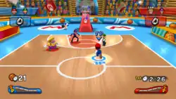 The game is played much in the vein of past Mario sports games, with features such as powerful special moves and over-the-top, arcade-like gameplay,[3] including the use of a "coin redemption system" that allows players to collect coins that are immediately spent on adding extra points to the next goal they score. Both cooperative and competitive local multiplayer modes are featured: depending on the sport, two players (two-on-two) or three players (three-on-three) can play cooperative multiplayer and four players (two-on-two) can play competitive multiplayer in two teams of two. Online multiplayer is also featured, with two players per Wii console joining up to play two-on-two matches either against friends or against random players.[4]