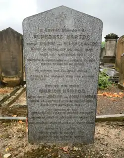 A little later Moss went to London and gained a livelihood as a teacher.[10] In August 1845, she married Paris-born Alphonse Hartog, with whom she had been taking French lessons, and shortly after her marriage established a boarding and day school for young children, which she continued to conduct until her retirement in 1884.[10] Hartog's pupils included her niece Sarah Marks,[11] who moved in with the Hartog family upon the death of her father in 1861.[12][13]