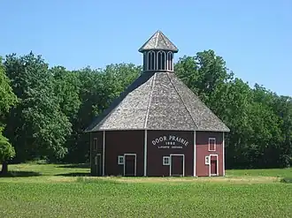 The first side, described above, is followed by side two with its window and four-foot-wide door. Side three has another window next to a door, and there is a smaller hay door on the upper level, above the window. Side four contains another window and door pair, while side five has the door and then the window with a smaller hay door above. Side six is roughly parallel to the road, has the door and window and on the upper level is painted: DOOR PRAIRIE 1878 LaPorte, Indiana. Side seven and eight both have doors and windows. Side eight has an upper-level hay door above the window. Side nine contains the final door-and-window combination. The combination of windows and doors is said to give the barn its name: "Door Prairie Barn".[2] The name also is an associations with in LaPorte County, which means "Door." The county was named because of a natural "door" between the woods to the north and east and the prairie to the west and south. This section of the county is called Door Prairie. This doorway was a landmark on the Indian trail through the area. It became the site of Door Village.[2]