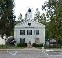Construction of a permanent courthouse began in 1854, and it was completed in 1855 for approximately US$12,000 (equivalent to $400,000 in 2024). Perrin (P.V.) Fox prepared the plans for a fee of US$100, which the Court of Sessions adopted on June 21, 1854, and Fox built the courthouse with his partner A.F. Shriver for a winning bid of US$9000; the contract for construction was let on July 21, 1854.[4] Wood for the courthouse was sourced from local pine forests and joined using mortise and tenon.[3] The site of the courthouse originally belonged to John C. Fremont, who granted the land to the county after the courthouse had been built.[3] The clock tower was added in 1866 to house a clock that had been imported from England.[3] The clock continues to sound every quarter-hour.[5] A small annex was constructed in 1900.[6]