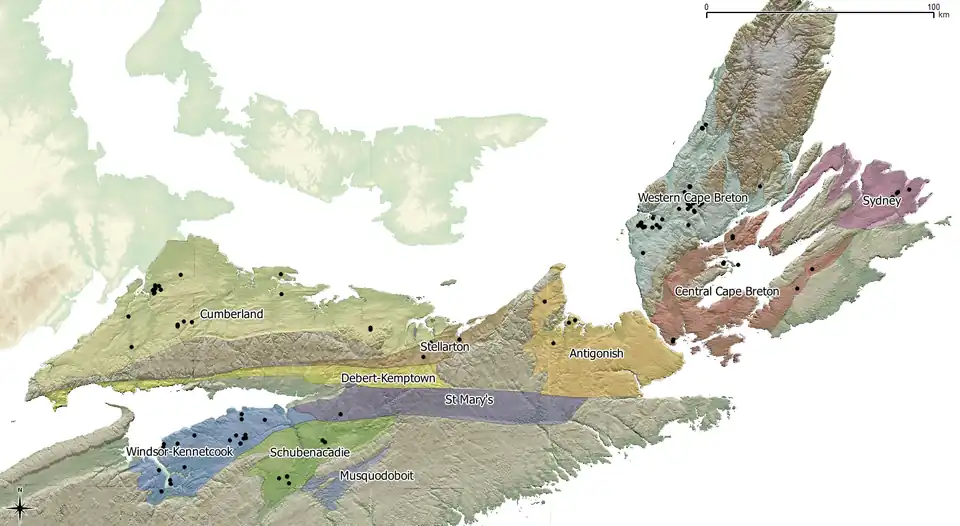 The Maritimes Basin is a Mid-Devonian to Early Permian sedimentary basin that underlies parts of the northeastern United States and Atlantic Canada.[1] It is a composite basin, meaning that it consists of many sub-basins, such as the Windsor-Kennetcook Basin of Nova Scotia. Some of these basins host important natural resources, including coal, petroleum, and minerals such as sylvite, halite, and barite. The Maritimes Basin was deposited and tectonically-modified during the final assembly of Pangea.