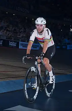 Sir Mark Simon Cavendish KBE (born 21 May 1985) is a Manx retired professional cyclist.[9] As a track cyclist he specialised in the madison, points race, and scratch race disciplines; as a road racer he was a sprinter. He is widely considered one of the greatest road sprinters of all time,[10][11] and in 2021 was called "the greatest sprinter in the history of the Tour and of cycling" by Christian Prudhomme, director of the Tour de France.[12]