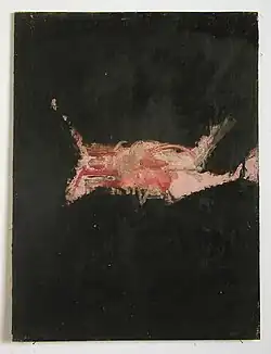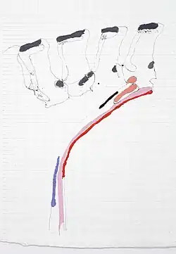 His large-sized series of paintings „allied“ (1994–1995), he palimpsestically applied shades of red paint to the backside of maps increasingly illustrate his principle of reduction: he reduces fragments of human figures in the context of the cartographical pattern. He starts experimenting with various work bases, works on book caskets and puts fine line networks as quadrature onto drawings on crude paper. Since 1998 he has chosen to work on smaller pictures which he has expanded to tableaus. The scarceness that leaves only the elementary keeps the balance between the carnal and the skeleton, framework and matter, line and colour and also between image and polyvalent characters. The reduction not only captures the figurative traces of the physical, but also the colours of the backgrounds as the blots of paints appear on them like injuries. „Armbrusr“ (1997–1999), „Hüllen“ (1998–1999), „Brust-korb“ (1998–2000) and „Weiß“ (2001–2003) are placed onto white backgrounds, „Passion“ (2001–2002) and „Schwarz“ (2002–2004) are placed onto shaded dark backgrounds. Increasingly the colour sentiment begins to change („Floaters“, 2005–2009), whereas the relations between base and pictorial feature, as shown by the writing pieces, are changed and in their configuration turn towards the ornamental.