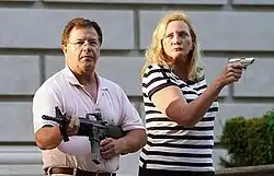 ![]() Mark and Patricia McCloskey standing outside of their St. Louis home armed with guns on June 28, 2020 | |