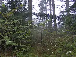 Unlike most of the high peaks of the eastern Smokies, neither the Tennessee-North Carolina state boundary nor any county lines traverse the summit of Marks Knob, and thus the mountain received little attention for most of recorded history. Trail guides from the early 1930s refer to the mountain as "Cam's Knob" and list its elevation as greater than 6,140 feet.[3] In the 1920s and early 1930s, two trails— the Rosser Trail and an unnamed spur trail— connected Dashoga Ridge to the logging camps at Smokemont to the southwest and Straight Fork to the southeast. The Rosser Trail ascended northeastward from Smokemont (namely, the Chasteen Creek area) across Hughes Ridge to Enloe Creek, and then over Highland Ridge to the Raven Fork Valley. The trail continued northward along Raven Fork around the western base of Breakneck Ridge to an area known as Three Forks, where the Left, Middle, and Right prongs of Raven Fork converge to form Raven Fork proper. Beyond Three Forks, the trail wound its way northward up the crest of Dashoga Ridge, crossing the summits of Marks Knob and Mount Hardison before joining the Balsam Mountain Trail. The area's only other trail ascended northwestward from Straight Fork, crossing Hyatt Ridge to McGee Springs. The trail then turned westward to traverse the crest of Breakneck Ridge and descend to Three Forks, where it joined the Rosser Trail.[4][5] By 1974, the Hyatt Ridge Trail had been developed along the crest of Hyatt Ridge, rising northward along the ridgecrest from Straight Fork and approaching Dashoga Ridge from the east.