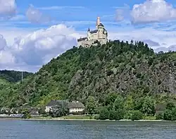 The Marksburg (German pronunciation: [ˈmaʁksbʊʁk]) is a castle above the town of Braubach in Rhineland-Palatinate, Germany. It is one of the principal sites of the Rhine Gorge UNESCO World Heritage Site. The fortress was used for protection rather than as a residence for royal families. It has a striking example of a bergfried designed as a butter-churn tower. Of the 40 hill castles between Bingen am Rhein and Koblenz the Marksburg was one of only two which had never been destroyed (the other being Maus Castle) and at least the only one that had never fallen into disrepair.[1]
