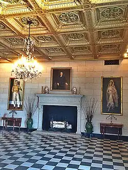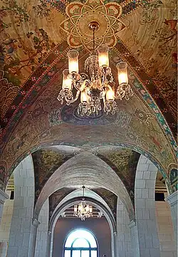 Accessed by a curved double staircase in the entrance hall, a multiple arched loggia with vaulted ceilings, featuring hand painted chinoiserie canvases, and a terrazzo floor with each tile individually poured between brass dividers, runs through the center of the house to the ballroom. Flanking the loggia are the sun room and living room where Marland displayed his collection of tapestries, paintings and works of art. The spacious ballroom features an ornate coffered ceiling that was gilded in $80,000 of gold leaf, and lit from imported Waterford crystal chandeliers with wrought iron bases that originally cost $15,000 each. To replace the ceiling and chandeliers today would cost an estimated $2 million. On the north wall are family portraits surrounding a large fireplace.[4]