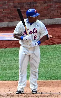 On February 1, 2013, Byrd signed a minor-league deal with the Mets.[15] Byrd hit a walk-off 2 RBI single on April 7 for the Mets on their way to a 4–3 victory over the Miami Marlins. Before a game on June 5, 2013, Byrd joked with Mets teammate Anthony Recker that he was going to hit two home runs in the game. Byrd did hit two home runs in the Mets 10-1 win over the Washington Nationals. Byrd hit .285 with 21 home runs and 71 RBI in 117 games for the Mets before being traded to the Pittsburgh Pirates. On August 27, Byrd and John Buck were traded to the Pittsburgh Pirates in exchange for infield prospect Dilson Herrera and a player to be named later,[16] identified on August 29 as Vic Black.[17][18] In his first game with the Pirates, Byrd hit a 3-run home run in Pittsburgh's 7-1 victory over Milwaukee. In the 2013 National League Wild Card Game, Byrd went 2-4 with a home run and 2 RBI, as the Pirates defeated the Cincinnati Reds 6-2.[19]