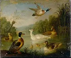 Sketches in the collection of the British Museum indicate that he based at least some of the birds in his paintings on drawings from life. He tended to paint domestic birds and common wild species, rather than the exotic varieties favoured by some other artists.[6] He sometimes introduced elements of drama such as attacks by predatory animals into his bird paintings, a feature shared with the works of Francis Barlow.[6] Buyers of his paintings often incorporated them into schemes of interior decoration, setting them into panelling above doors or fireplaces.[4][6]