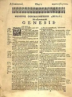 - ^ The funding required for the effort involved in the translation and the printing was provided by a charter from the Society for the Propagation of the Gospel, which was renewed by Charles II.[37] The text of the dedication can be read in Records of the colony of New Plymouth, in New England, Volume II, published 1855.[38]