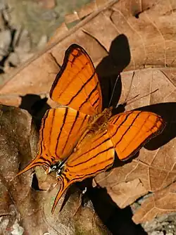 - ^ a b c d e f g h i j Benson, Woodruff W. & Emmel, Thomas C. (March 1973). "Demography of Gregariously Roosting Populations of the Nymphaline Butterfly Marpesia berania in Costa Rica". Ecology. 54 (2): 326–335. Bibcode:1973Ecol...54..326B. doi:10.2307/1934340. JSTOR 1934340.