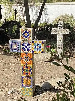 Burials are now marked with contemporary crosses in various artistic styles made by Pascual Márquez's grandson Ernest Márquez. A photo from the 1890s shows a few wooden crosses placed on graves, “all of them [now] long gone.”[4] Ground-penetrating radar La Senora Research Institute, which has the Cemetery preservation as one of its "missions", arranged for UCLA geo-physicists Cotsen Institute of Archaeology to map the individual burials. From the Santa Barbara Trust for Historic Preservation, La Senora arranged for search dogs trained in "historical human remains detection" to confirm the lost locations of the graves.[6][7] The finale was when geophysicist Dean Goodman had the fourth graders of Canyon Elementary School drag his GPS equipment around the cemetery exclaiming whenever they 'found' a burial. This project won the 2009 Governor of California's Award for Historic Preservation Education for La Senora and UCLA's Cotsen Institute.